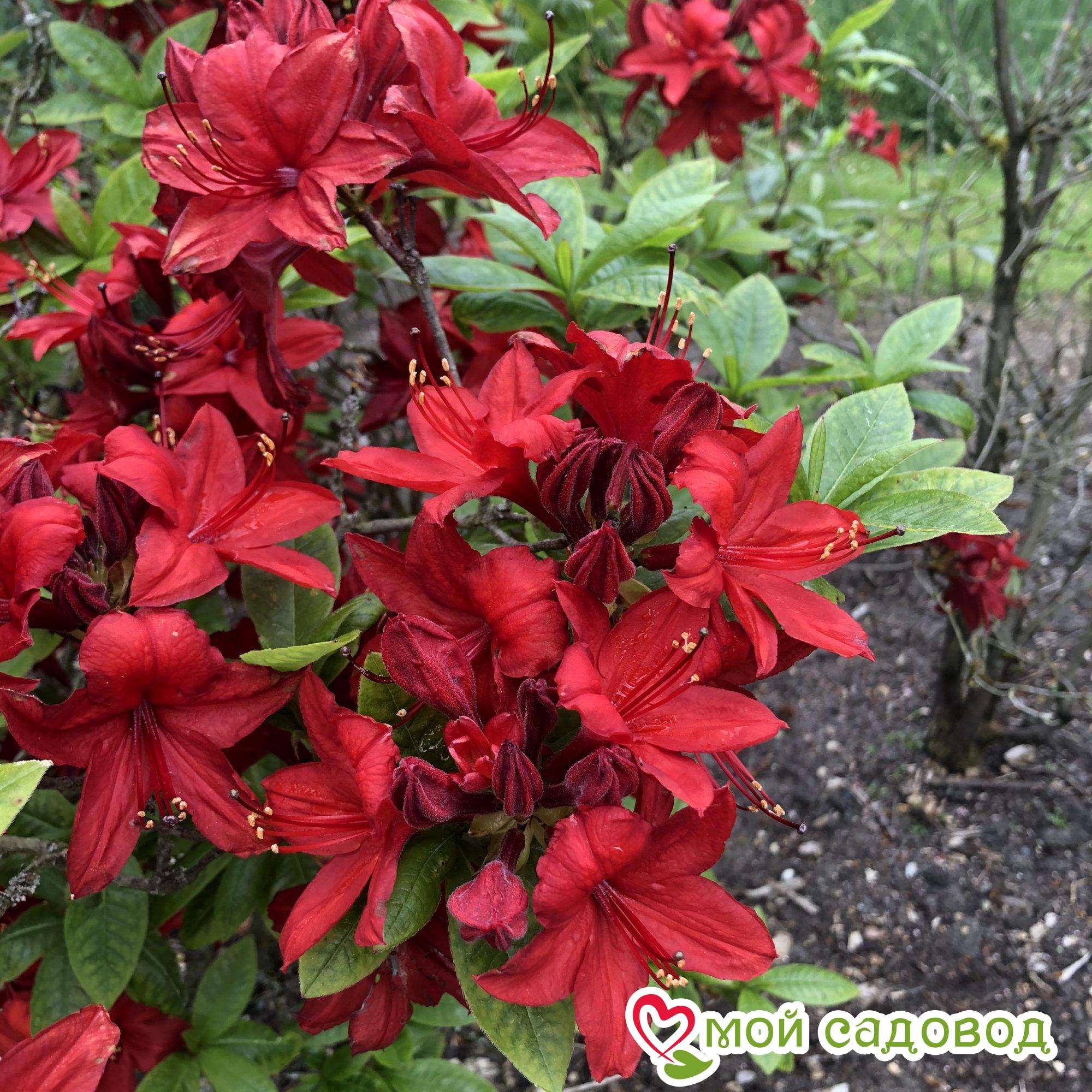 Сорт с огненно-красными цветками. Непревзойдённый среди красных сортов. Растение формирует округлый плотный куст, высота примерно равна ширине, обычно рододендрон не превышает от 0,6 до 0,8 см по двум параметрам. Сорт используется для декорирования одиночных и групповых садовых композиций. При посадке в открытый грунт выбирайте для рододендрона безветренные участки, находящиеся в полутени. Гибрид адаптирован под условия холодных зим и хорошо переносит понижение температур до -30C. Однако из-за особенности корневой системы растение в холодный период нуждается в воздушно-каркасном укрытии. Чтобы цветение было максимально декоративным, вносите комплексные удобрения 2-3 раза за сезон.
