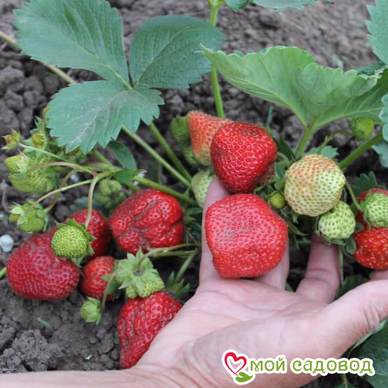 Ягоды крупноплодной клубники Виктории имеют крупный размер ягод. Техническая спелость наступает, когда ягоды приобретают ярко-красный окрас, но со временем он темнеет. Желтоватые семена средне углублены. Мякоть окрашена в розовый цвет, плотная, средней сочности. У неё приятный запах земляники средней интенсивности. Вкус этой клубники гармоничный, кисло-сладкий. Сорт формирует мощные кусты, пускающие многочисленные усы. Листья имеют крупные размеры и окрашены в интенсивный зелёный цвет. Цветоносы не отличаются силой и припадают под тяжестью плодов к земле. Посадка и уход за клубникой Посадка: осенью (с середины августа до середины октября) и ранней весной Освещение: яркий солнечный свет Почва: легкая – суглинок, супесь, чернозем или лесные, богатые органикой грунты с водородным показателем pH 5,7-6,2 Полив: утренний, с конца апреля – один раз в 10-12 дней, расходуя на каждый м² участка 10-12 л воды Подкормки: минимум три раза в год: ранней весной, в период бутонизации и в августе Обрезка: когда листья начнут желтеть, покрываться пятнами и сохнуть, их обрезают Размножение: усами (розетками), делением куста